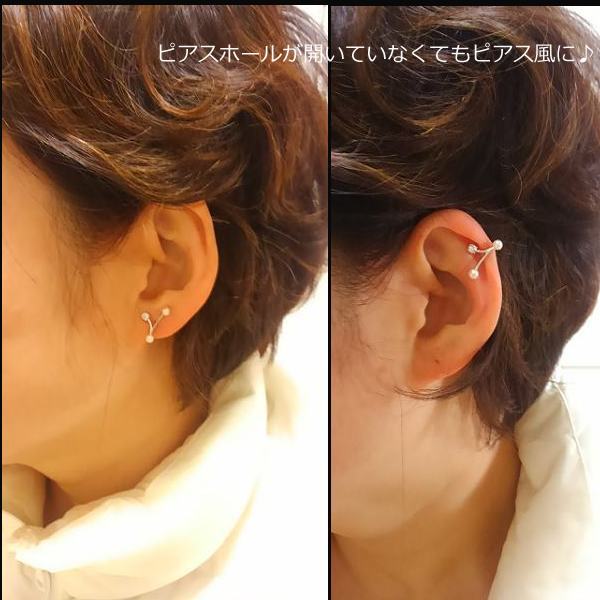 耳の根元から滑らせて挟むだけのイヤークリップは、 つけ外しも簡単で、圧迫感が少なくイヤリングよりも痛くなりにくいデザインです。